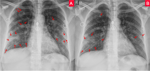 Figure 5. Two chest x-rays in a 40-year-old woman with COVID-19. (A): PA chest x-ray obtained on day 7 illness shows right upper, middle, and lower zone ground-glass opacity with peripheral lower zone consolidation, left middle and lower zone ground-glass opacity and small nodular patches with score 5; (B): PA chest x-ray obtained on day 13 illness shows right upper, middle, and lower zone ground-glass opacity with peripheral lower zone consolidation. Also, mild improvement is noted with score 3.